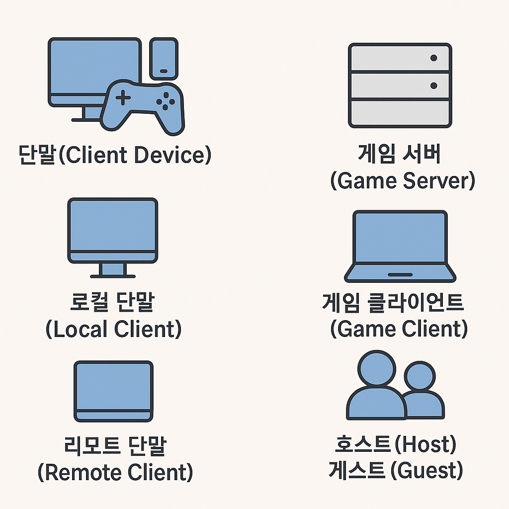 - 단말(Client Device): 게임을 플레이하는 컴퓨터, 게임기, 스마트폰, 태블릿 등 네트워크에 연결된 기기