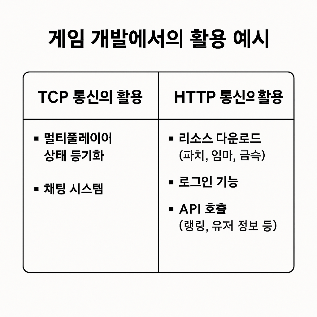 게임 개발에서도 TCP와 HTTP는 각기 다른 용도로 자주 사용된다.